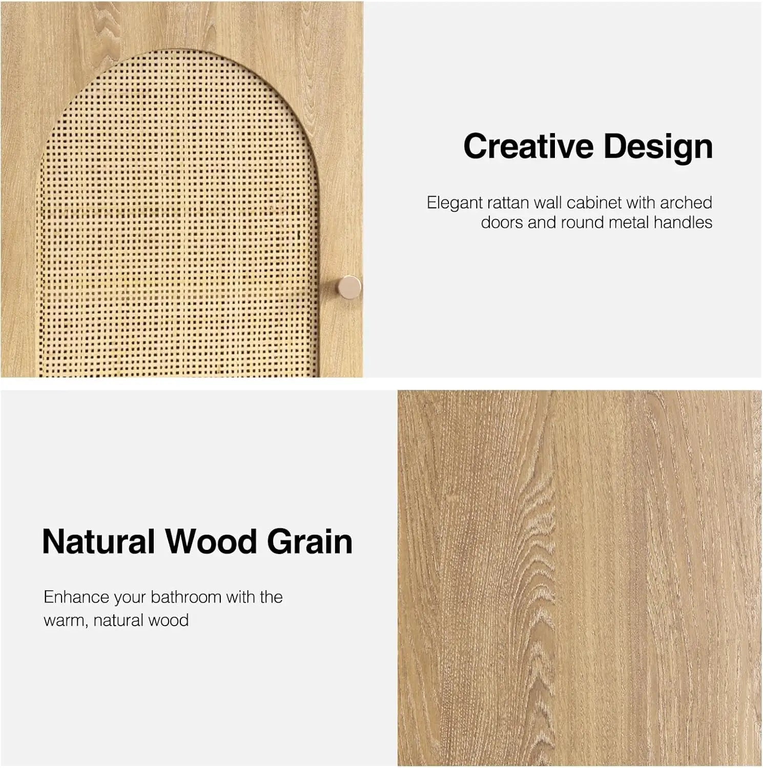 - Elegant & exquisite: Our wall mounted storage cabinet features arched handmade rattan door and open shelf, suspended above the sink countertop. The exquisite bathroom wall cabinet fully demonstrates the charm of handmade rattan art lines, wave wood grain and plant decoration complement each other. Bohemian style is full of unique cultural charm and natural beauty
