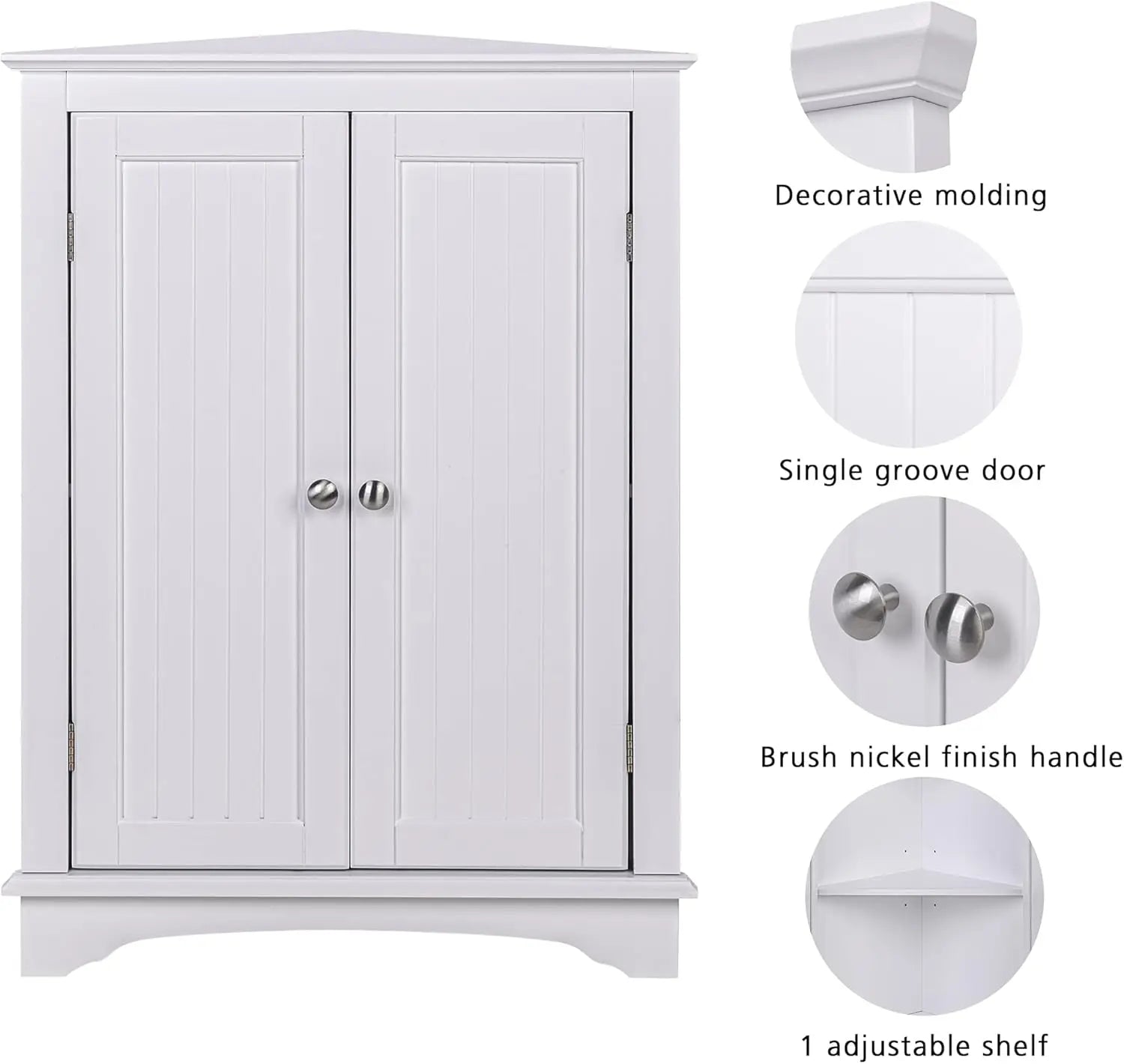 - ELEGANT DESIGN: Two beadboard doors and silver knobs make the white corner cabinet elegant and sleek, blending well with any room style. The corner cabinet with doors is a perfect addition to your bathroom, kitchen, or living room.